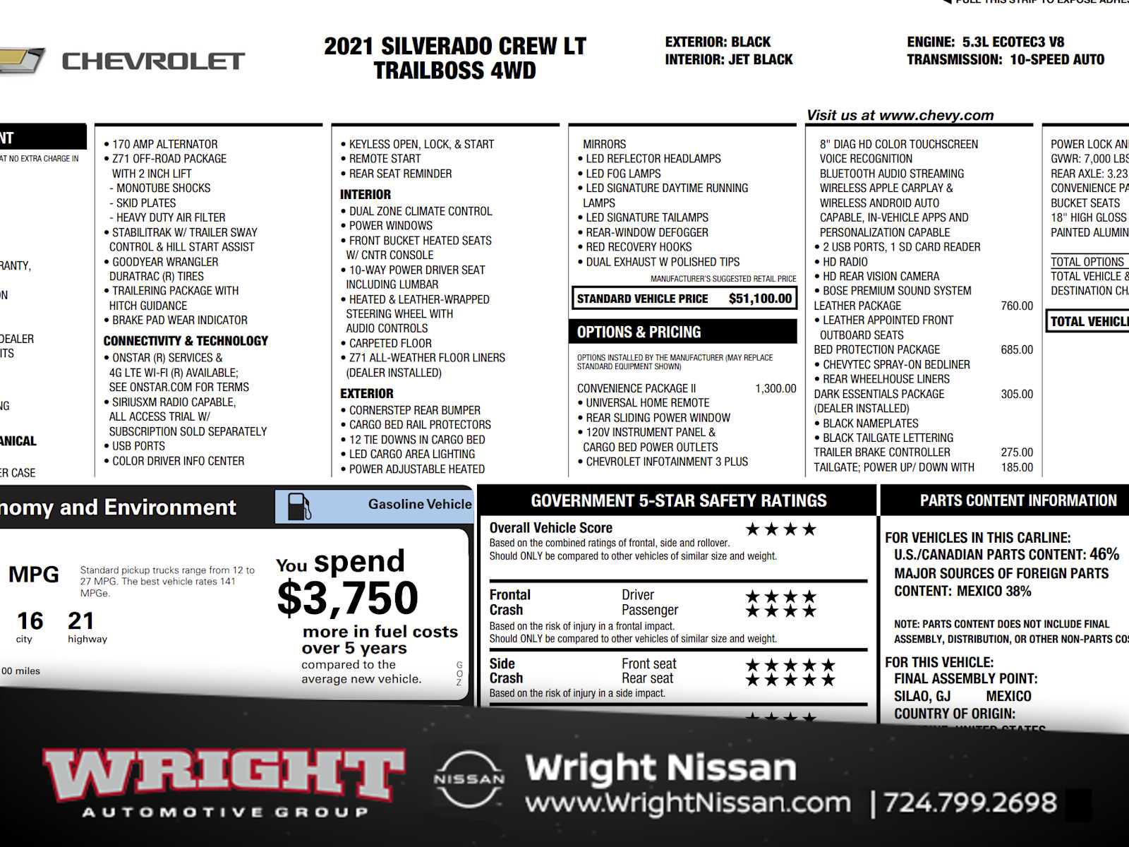 CONVENIENCE PACKAGE II includes (UG1) Universal Home Remote, (A48) rear sliding power window, (KI4) 120-volt power outlet, (KC9) 120-volt bed-mounted power outlet, (IOS) Chevrolet Infotainment System with 8 diagonal color touch-screen with (MCR) USB ports, SiriusXM with 360L, (U2L) HD Radio and (UVB) HD Rear Vision Camera Includes (UQA) Bose Premium Sound System. Certain 21MY vehicles will include (RG0) Not Equipped with HD Radio, which removes (U2L) HD Radio. See dealer for details.), LEATHER PACKAGE: Includes (SNR) Up-level Rear Seat with Storage Package. BED PROTECTION PACKAGE includes (B1J) wheel house liners and (CGN) Chevytec spray-on bedliner, LPO, DARK ESSENTIALS PACKAGE: includes (RIK) Black Silverado nameplates, along with where applicable, Black Custom/LT/RST/LTZ/High Country/6.2L/Duramax badges, LPO and (SB7) Black tailgate CHEVROLET lettering, LPO, (dealer-installed), TRAILER BRAKE CONTROLLER, INTEGRATED, AUDIO SYSTEM, CHEVROLET INFOTAINMENT 3 PLUS SYSTEM 8 diagonal HD color touchscreen, AM/FM stereo, Bluetooth® audio streaming for 2 active devices, wireless Apple CarPlay® and Android Auto® capable, voice recognition, in-vehicle apps, cloud connected personalization for select infotainment and vehicle settings. Subscription required for enhanced and connected services after trial period. ENGINE, 5.3L ECOTEC3 V8 (355 hp [265 kW] @ 5600 rpm, 383 lb-ft of torque [518 Nm] @ 4100 rpm); featuring available Dynamic Fuel Management that enables the engine to operate in 17 different patterns between 2 and 8 cylinders, depending on demand, to optimize power delivery and efficiency (STD), TRANSMISSION, 10-SPEED AUTOMATIC, ELECTRONICALLY CONTROLLED with overdrive and tow/haul mode. Includes Cruise Grade Braking and Powertrain Grade Braking (STD) (Most vehicles built on or after 6-7-2021 with a V8 engine and (MQB) 10-speed automatic transmission will have (NSS) Not Equipped with Automatic Stop/Start, which removes Automatic Stop/Start and its content.), SEAT, UP-LEVEL REAR WITH STORAGE PACKAGE 60/40 folding bench for Crew Cab models, includes full-length bench seat, seatback storage on left and right side, center fold out armrest with 2 cupholders, full cab width underseat storage, (includes child seat top tether anchor). Rear Air, Hands Free, Privacy Glass, Electronic Stability Control, Heated Mirrors. Serviced here, New Tires, All scheduled maintenance up to date